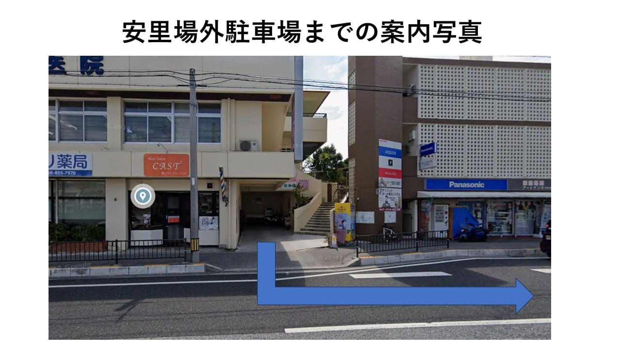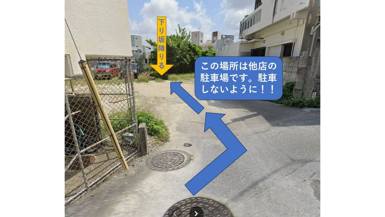 場外駐車場へ行く途中に、他の店舗の駐車場をとおります。そこには間違って駐車しないようおねがいします。