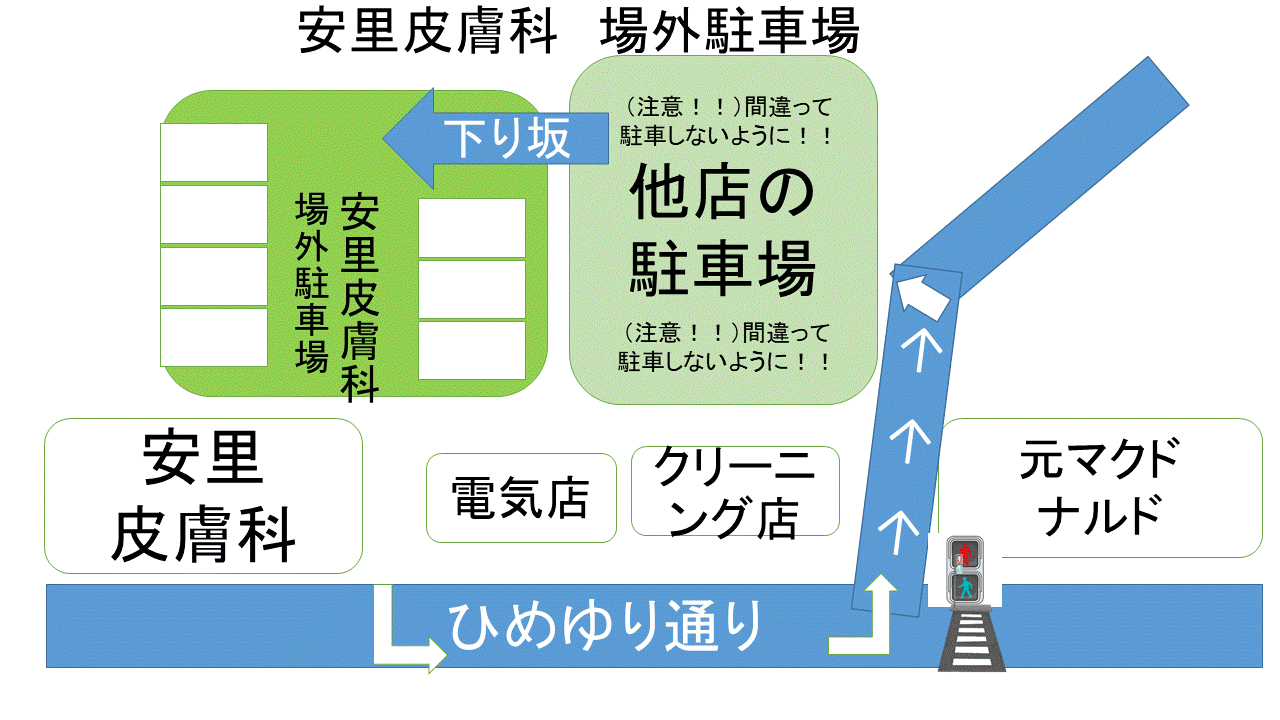 第1駐車場は当院1階にあります。(6台駐車可能) 第2駐車場はR8年2月末日で廃業しました。代わりに場外駐車場(7台駐車可能)と契約してます。場外駐車場は当院ウラになりますが、複雑な場所にあるので利用の際はスタッフに確認してください。駐車場利用の際は当院1階駐車場や場外駐車場、周囲のコインパーキングをご利用ください。当院傍の歯科医院より奥に行くと、有料のLAパーキング(090-1940-2294 予約も可能)があります。有料ですが低額でかりれます。