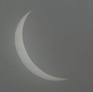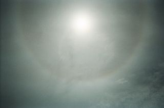 食の最大に近づいた頃、太陽はカメラ(使い切りカメラ、携帯カメラ)で撮せる程 の明るさとなっていた。左の写真には太陽の周りに虹?のようなものが観測された。使い切りカメラで撮影。