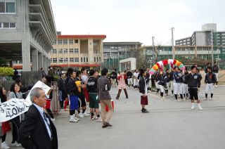 ![]() | 学校では、校長をはじめ部活生が横断幕また、アーチを作って迎え、 PTAでは暖かいぜんざいを準備して待っていた。感動!!。第1回大会より、参加人数も増えまた完歩時間も早くなっていた。 生徒参加の内訳は 1年:41名 2年:7名 3年:15名 の計63名。 |
