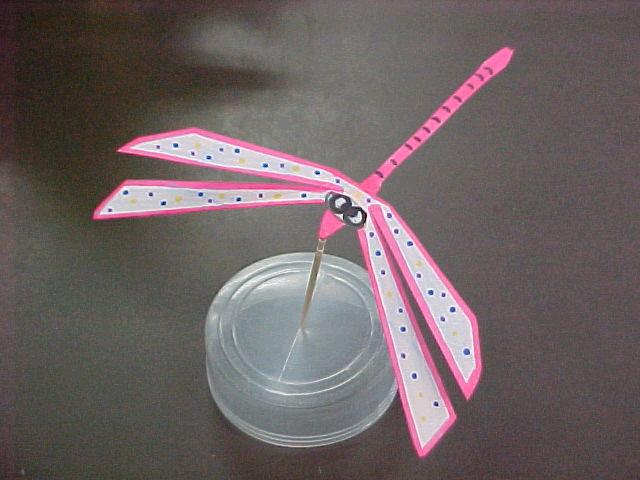 三. 作り方 @型紙の指示通り、はさみで切り、のりずけしてトンボの形を作ります。 A色鉛筆でトンボに色づけをします。 B前羽を深く下に折り曲げ、次の後ろ羽を浅く折り曲げます(写真参照)。 Cしっぽを上にそらせ、くちばしと首の点線の部分を下に折り曲げる。 Dくちばしを鉛筆の先や指の先に乗せるとトンボのくちばし一点だけでバランスよく止まる。