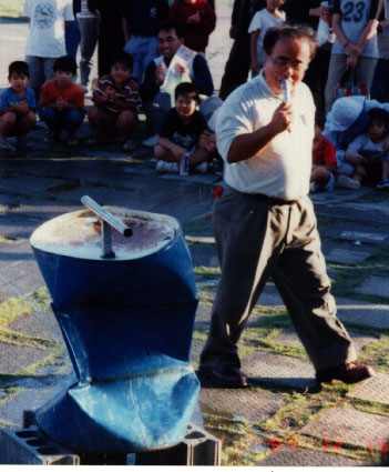 三.やり方 2個のブロックの上にドラム缶をのせる。 ドラム缶にやかんの水を2リットル程注入する。 ドラム缶の下にガス釜を置き、加熱する。 缶の口から勢い良く水蒸気が出たら、濡れた軍手でドラム缶に蓋をして強く締め付ける。ここで強く締め付けるのがこつ! 加熱をやめ、ホースで水をかけます。2分ほどで突然ドラム缶はペシャンコにつぶれます。