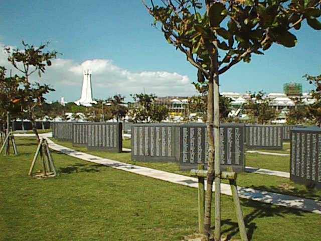 ![]() | ここには太平洋戦争時に沖縄戦で亡くなった人々の名が黒く光る花崗岩に刻まれている。本土から送り込まれた兵隊、アメリカ兵、地元住民が隔てなく存する。 |