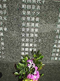![]() | ふとした思いつきで戦死した祖父の名を探す。あった。沖縄でここに縁ある人の名の刻まれぬ人はいないのだ。実は私は、この祖父の名を受け継いでいる。ここにあるのは私の名。祖父も戦争も記憶はないが、私は確実に過去と繋がっている。先ほどのガイドへの返事。「ここは憎しみの場所ではない。」 おじいさん、今日は貴方が導いたのか? 献花していきます。 |