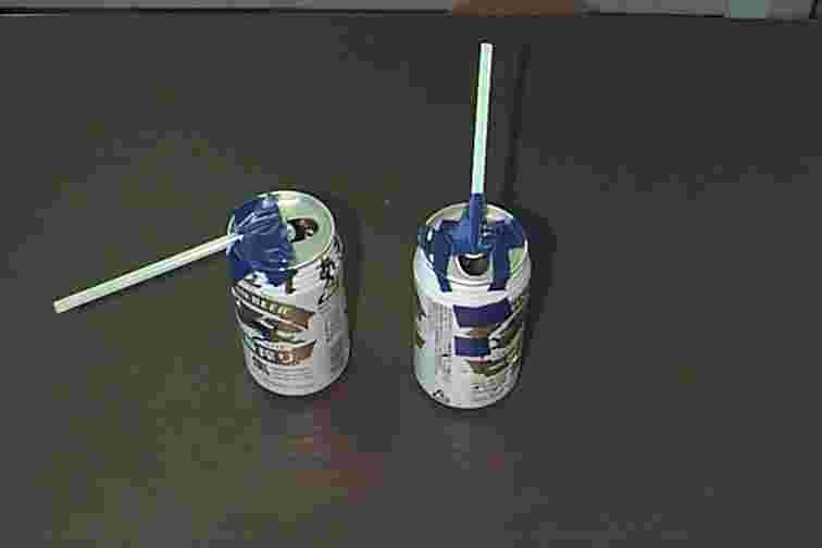 - ストローを缶の口に付け角度を変えよく音の出るところを探す。