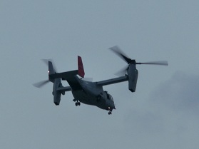 夕陽が深く傾いた17時33分頃 隊長機が普天間飛行場に戻ってくる。16時30分あたりに普天間から飛行した機。嘉数高台から目視、周辺すべて民家学校等公共施設多々夥し。その前に戻ってきたオスプレイ機よりも高めの高度で普天間飛行場進入。さらに後方より他の航空機が着陸航路で進入。着陸途中のオスプレイ隊長機は滑走路を低空飛行で譲る。普天間では同じ航空機が何度もタッチアンドゴーを繰り返す。この場所でこれほど過密に飛行を繰り返す理由を知りたい。