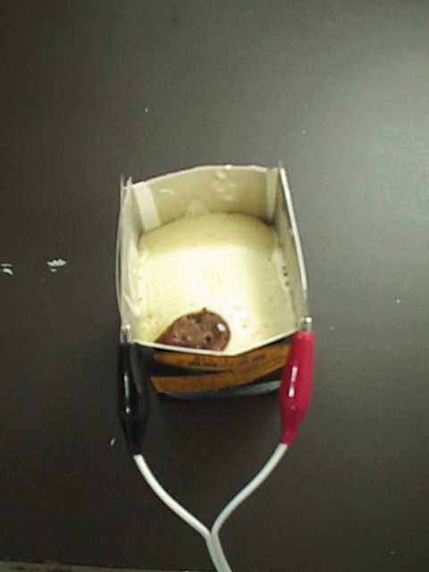 敗戦直後実際に市販されていたパン焼き器を作ろう。電極板の間にパン種を流し込み電灯線100[V]を電通すると、パン種内部に電流が流れて発熱しパンを焼くことができます。しかも焼き上がると自動的にストップして焼きすぎを防ぐという見事な物です。これは、電流による「ジュール熱」の発生だけでなく「電気抵抗」やイオンの学習にも使えます。