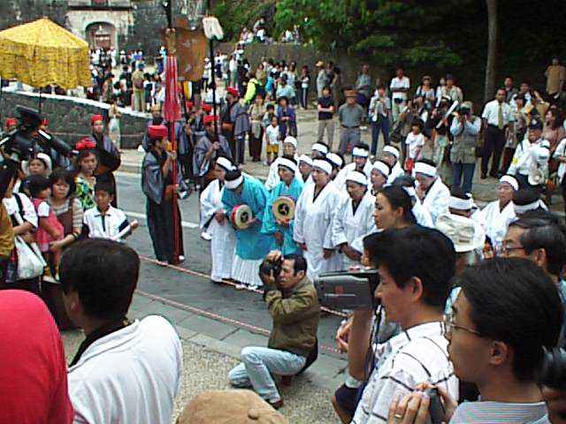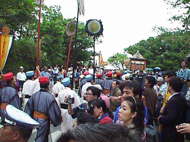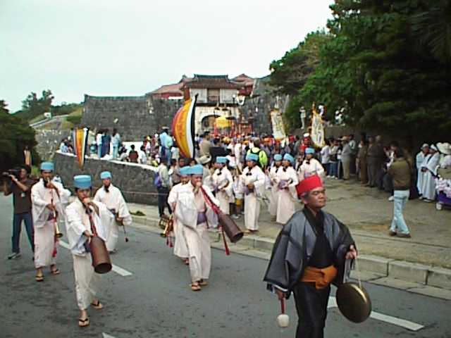 城から出てきた一行(国王、王妃、女官など)は守礼門の東側にある園比屋武御獄石門で御願をする