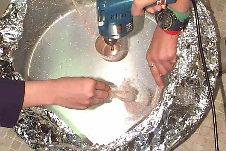 ザラメを溶かしてからアルコールランプを消し、ザラメを少し冷ましてからドリルを回すとわたがいっぱい出ます。