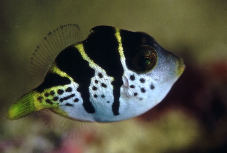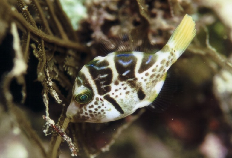 | テレコンにピッタリの被写体を発見してしまいました。1cmほどです。海藻類やヤギが生えているあたりに潜んでる場合が多いのですが、夜は海藻をくわえて眠るそうです。ぜひナイトで激写したいですね。有毒なシマキンチャクフグに擬態していることは有名ですが、見事によく似ています。背びれ、ハラビレの形態でしか見分けられません。チビもチビなりに同じ模様ですね。 |
